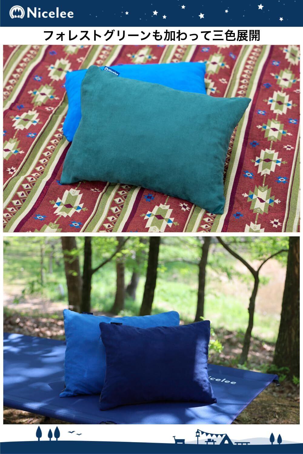 【柔らかな肌触りのモイスチャースウェード生地】 キャンピングピローのカバーには、肌に優しいモイスチャースウェード生地を採用。いつでも清潔に保つことができる洗濯対応です。ナイスリーの代名詞、ブルーのカラーリングがアウトドアシーンにもピッタリ。【こだわりの3色展開】 枕カバーはスカイブルー、インディゴブルー、フォレストグリーンの3色。スカイブルーの枕カバーには収納袋はホワイト、インディゴブルー、フォレストグリーンの枕カバーには収納袋はインディゴブルーをそれぞれコーディネート。