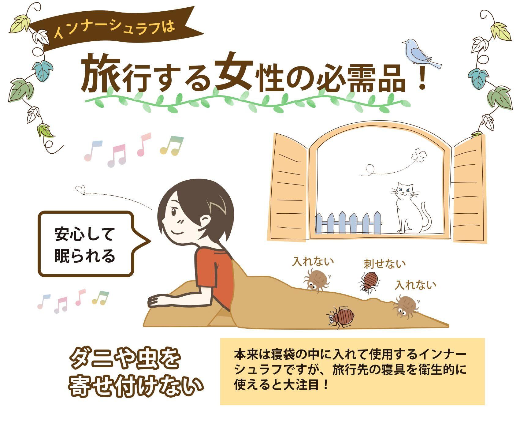 ■インナーシュラフはキャンプ・災害時等様々なシーンで活躍 重さ180gという超軽量 キャンプ・登山・アウトドア、ツーリング、緊急時、災害用、車中泊、突然の外泊、列車の寝台、会社での外泊、出張先、カプセルホテル、ビジネスホテルや簡易宿泊などでのトラベルシーツ、トラベルライナーとしてもおすすめ