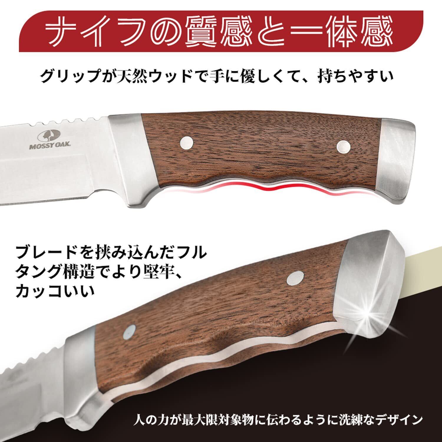 MOSSY OAK ナイフ アウトドアナイフ シースナイフ フルタング構造 全長225mm 天然ウッドハンドル 登山 キャンプ トレッキング 釣り 家庭用 DIY用 防災用 専用シース付き