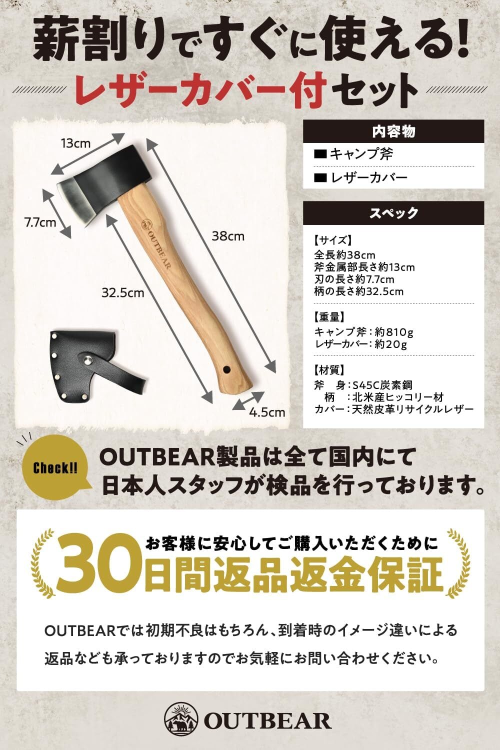 【よくある質問】切れ味が悪い場合:通常、斧を購入した際、刃がついていないものが多くありますが、本製品の二度研磨は、斧をすぐ使用できるような鋭さに研磨をしているためであり、ナイフのような鋭い切れ味にするためでございませんのでご留意ください。斧自体の刃が鋭すぎると、刃欠けが起きやすくなったり、刃先がすぐに悪くなりやすくなります。より鋭くして使用する場合は、ご自身で研いでご使用くださいますようお願いいたします。【製品関連情報】材質:S45C炭素鋼 (斧身) 北米産ヒッコリー材(柄) 天然皮革リサイクルレザー(カバー) サイズ(約):全長38cm 刃の長さ7.7cm 重量:本体810g カバー20g 【お問合せ先】OUTBEAR(アウトベアー)製品は日本企業が企画開発・検品・販売・サポートを行なっております。購入後30日間の返品返金可能です。購入後の不明点や不良など、すぐに対応します。