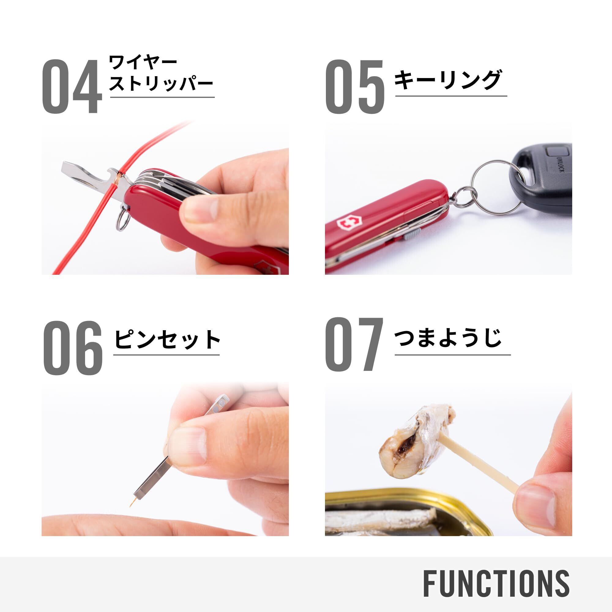 7機能: プラスドライバー、ワイヤーストリッパー、せん抜き、はさみ、ツースピック、ピンセット、キーリング