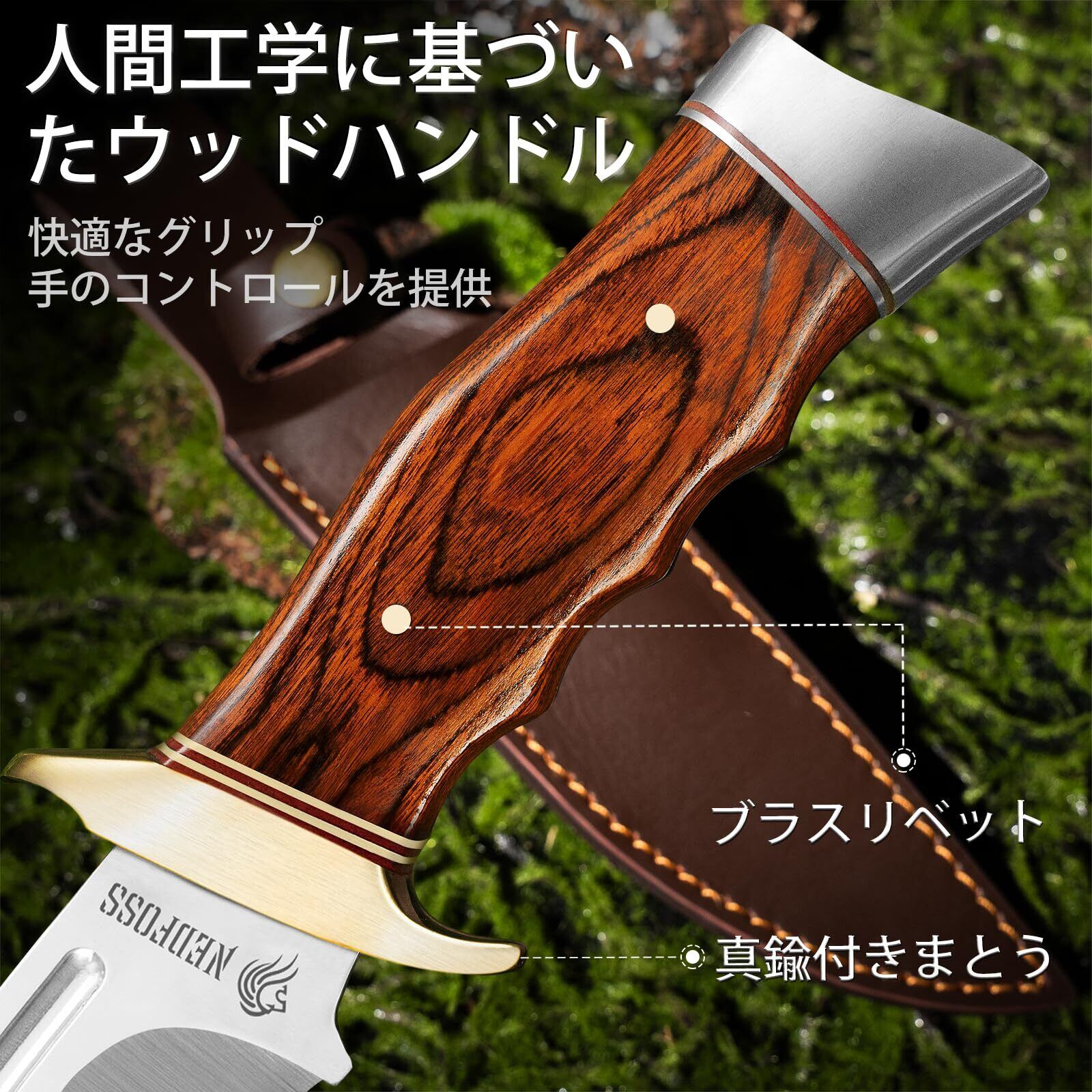 NedFoss SA78 ナイフ アウトドア キャンプ シースナイフ 440刃素材 彩木ハンドルフ 3.8mm厚ブレード 全長310mm 狩猟 登山 トレッキング 釣り 家庭 DIY 防災用 専用革シース付き