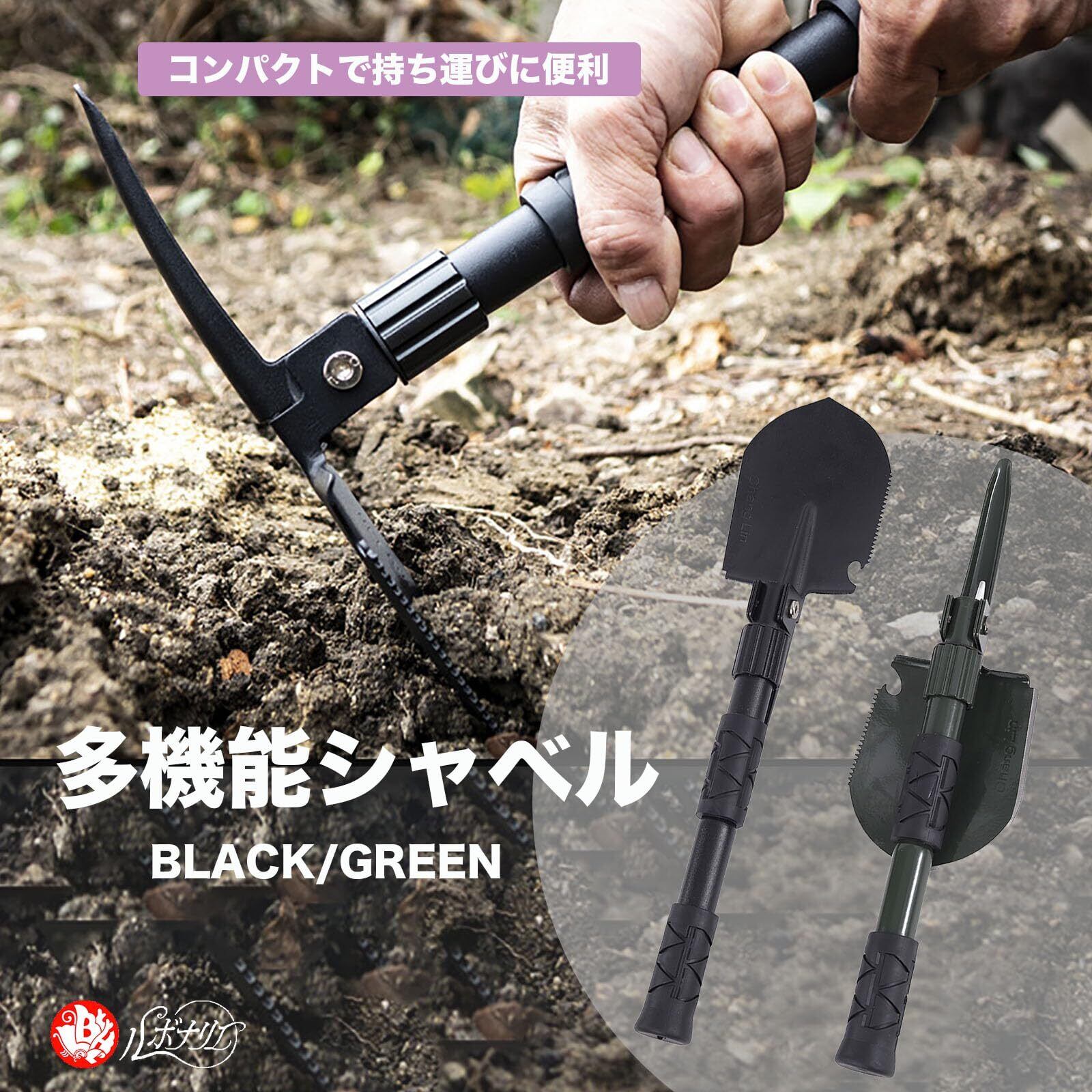 アウトドアやガーデニングで活躍する多機能シャベルです。ブラックとグリーンの2カラーをご用意いたしましたので、お好みに合わせてお選びください。