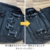 【重い荷物も楽々】折りたためるホイールが下についているので、重たい荷物を入れてもキャリーカートとして運搬できます。耐荷重は約5kgです。