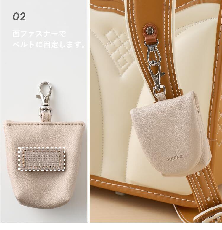 このケースにはカラビナが付属しているため、バッグやランドセルに簡単に取り付けることができます!外出時の紛失を防ぎ、安心してお使いいただけます。