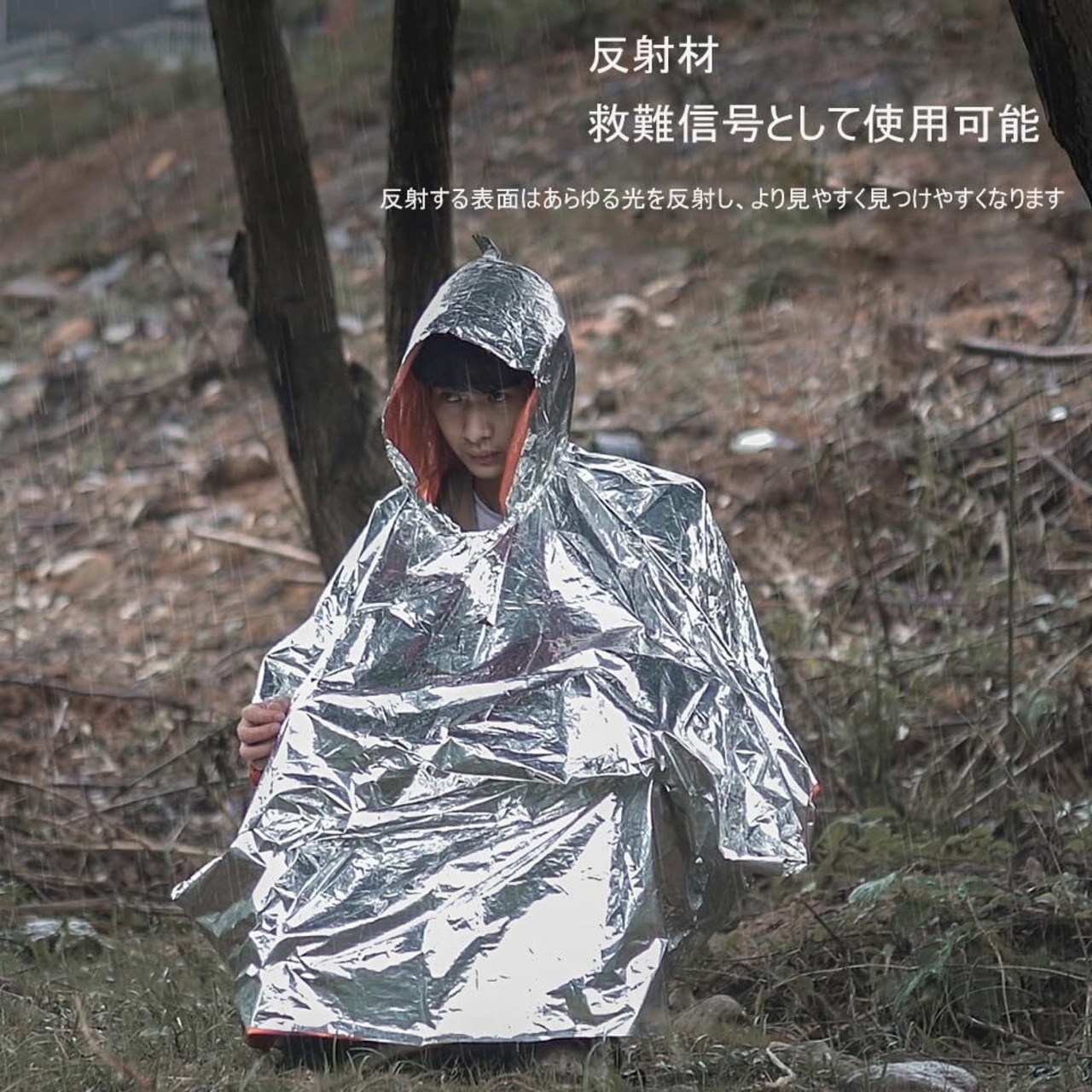 【多機能デザイン】: 防寒用レインポンチョとしてだけでなく、光を反射して信号を送る反射膜としても使用でき、荒野探検、旅行、緊急救助など様々な状況に適しています。
