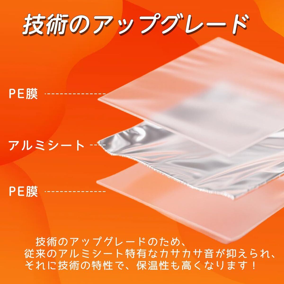 【改良された技術】改良された技術により、アルミの上にPE素材をかばーし、厚みは従来品により3倍アップ!気になるカサカサ音が抑えられて、それに保温性も高くなりました!