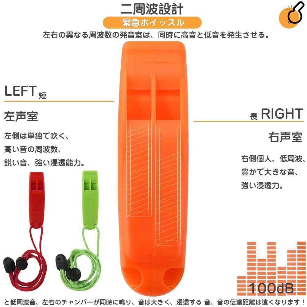 二重周波数と大音量、緊急サバイバルホイッスル。左側と右側の異なる周波数の発音室は、同時に高音と低音を生成します。低周波音、異なる環境と条件の下で優れた浸透性を確保し、より長い音の伝送距離!注意:怪我をしないように、他人の耳に近づけないこと!!!!