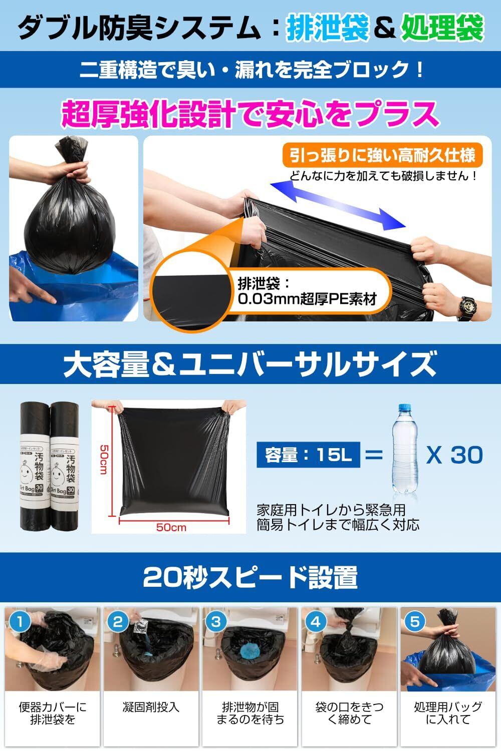 【15年保存可能な大容量60回分セット】酸化防止アルミシート内蔵包装により15年間の品質保持が可能。セット内容は凝固剤60回分・排便処理袋60枚・防臭密封袋5枚・手袋120組を同梱。大人3人分の2日間使用に最適な設計で、コンパクト収納袋(縦25cm×横18cm×厚さ5cm)で場所を選びません。