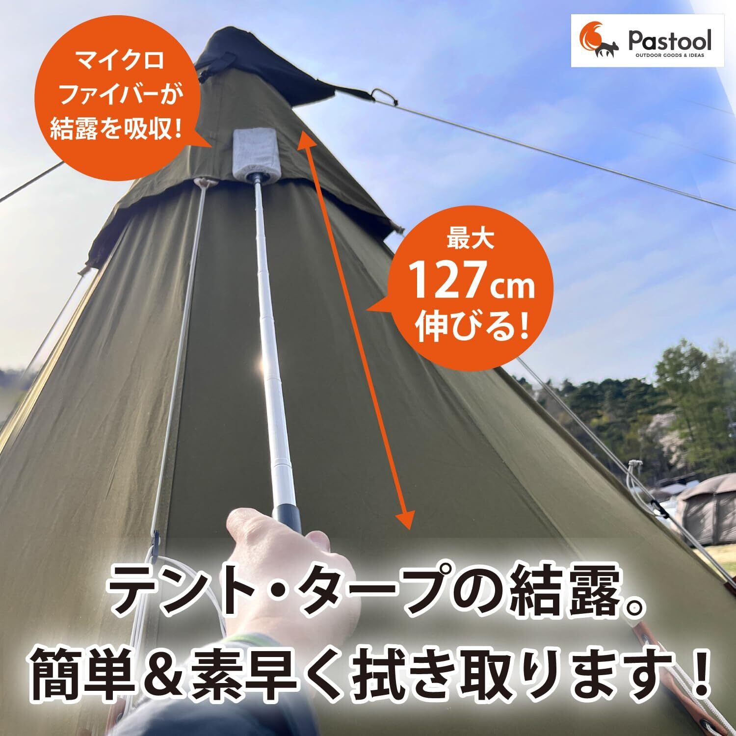 夜露などで濡れたテント&タープに。付属のマイクロファイバーが結露を吸収!簡単に素早く拭き取ります!テント&タープの撤収時間をスピードアップ!市販の不織布やタオルペーパーも取り付けて使用できます。51cmから最大127cmまで伸びるので、高いところもラクラク!しなるのでテントやタープに沿って拭き取りできます。また、ご自宅の家具のすき間汚れのお掃除にもご使用になれます。
