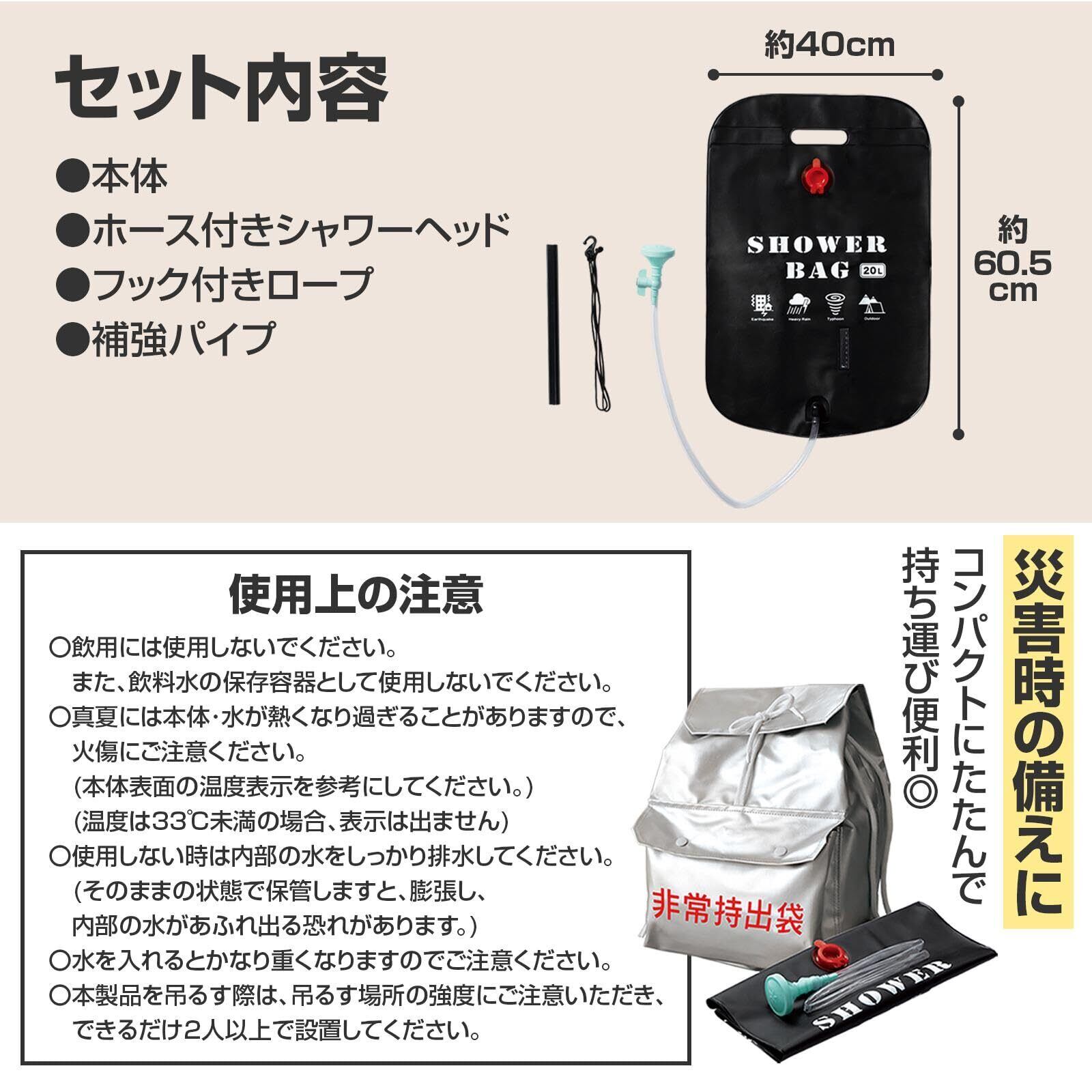 コモライフ サッと使える 携帯シャワーバッグ 20L 携帯 簡易 シャワー 水温計 アウトドア 非常時 防災