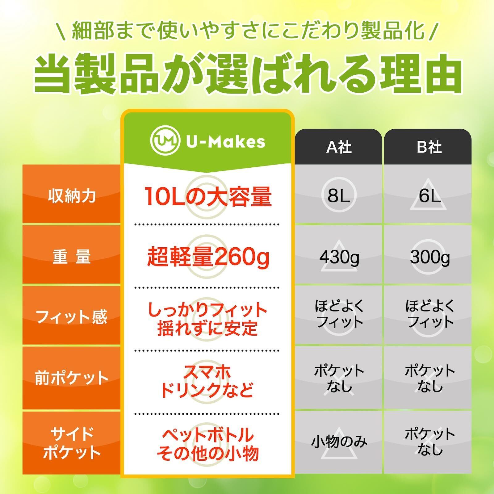 【容量たっぷり 10リットル】 ランニング中に必要な荷物が多い場合も、10リットルの大容量があります。タオルや水筒、ウェアの着替えなどを入れることができ、荷物が多いランニングでもストレスを感じずに走ることができます。
