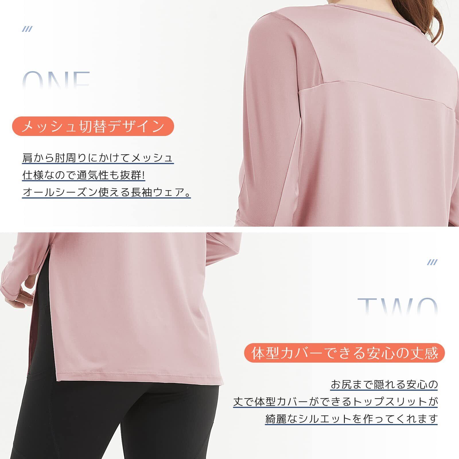 【デザイン】肩から腕に掛けてのシースルーのメッシュデザインで通気性が良く見た目もちょっぴりセクシーで大人かわいいを演出。指穴タイプなので、袖のズレを防ぐことが可能。
