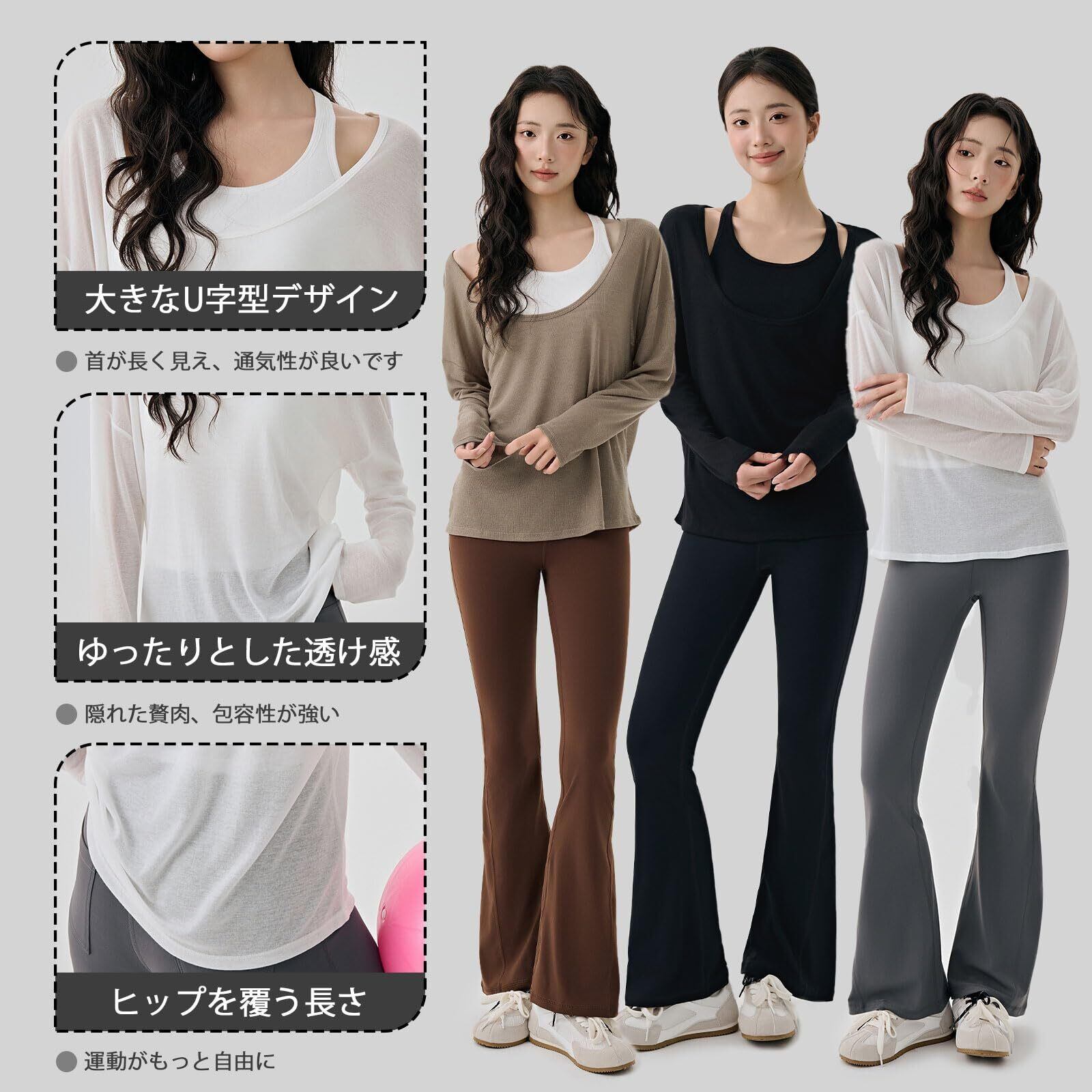 [IRCOLVE] スポーツウェア Tシャツ レディース ゆったりした長袖 ヨガウェア トップス 春秋 ランニング ピラティス ジム 透け感 速乾 体型カバー